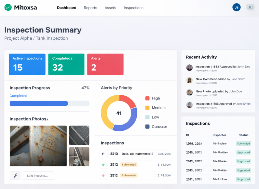 Mitoxsa helps engineering teams manage inspections, capture field evidence and maintain a complete asset history across warehouses, sites and projects.